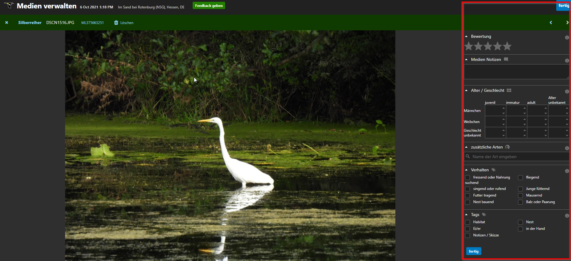 Die Kommentare zu einer Art oder Beobachtung auf einer Checkliste (Beobachtungsdetails) unterscheiden sich von den Mediennotizen, die einem Video hinzugefügt werden. Mediennotizen beziehen sich auf das betreffende Video, während sich die Beobachtungsdetails auf die gesamte Beobachtung beziehen, die oft nicht nur aus dem Vogel besteht, den Sie aufgenommen haben. Dies ist ein feiner, aber wichtiger Unterschied. Die Mediennotizen werden an das Video angehängt, die Beobachtungsdetails an die Beobachtung.