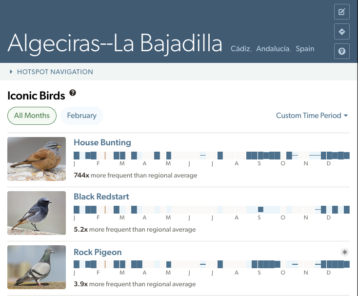Another example: House Bunting has recently colonized Europe from north Africa. One of the best places to see it in Spain is Algeciras--La Bajadilla, where House Bunting is among the top Iconic Birds.
